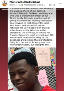 Demario was a student at Plantersville Middle School, where his teachers, classmates, and friends remember him as a bright, kind-hearted, and respectful young man who had a contagious smile and a promising future. The school released a statement on Friday morning expressing deep sorrow and extending heartfelt condolences to his family.